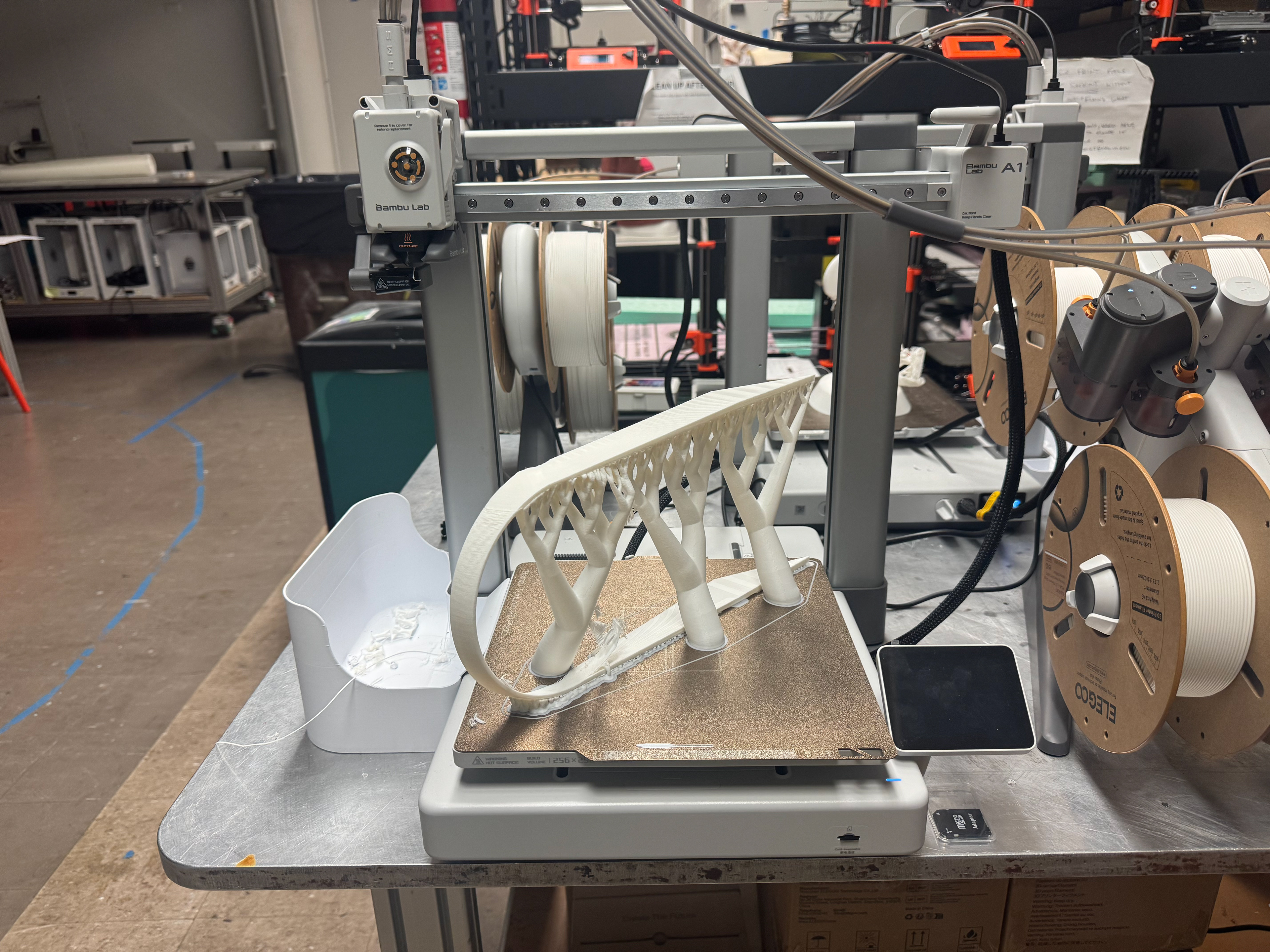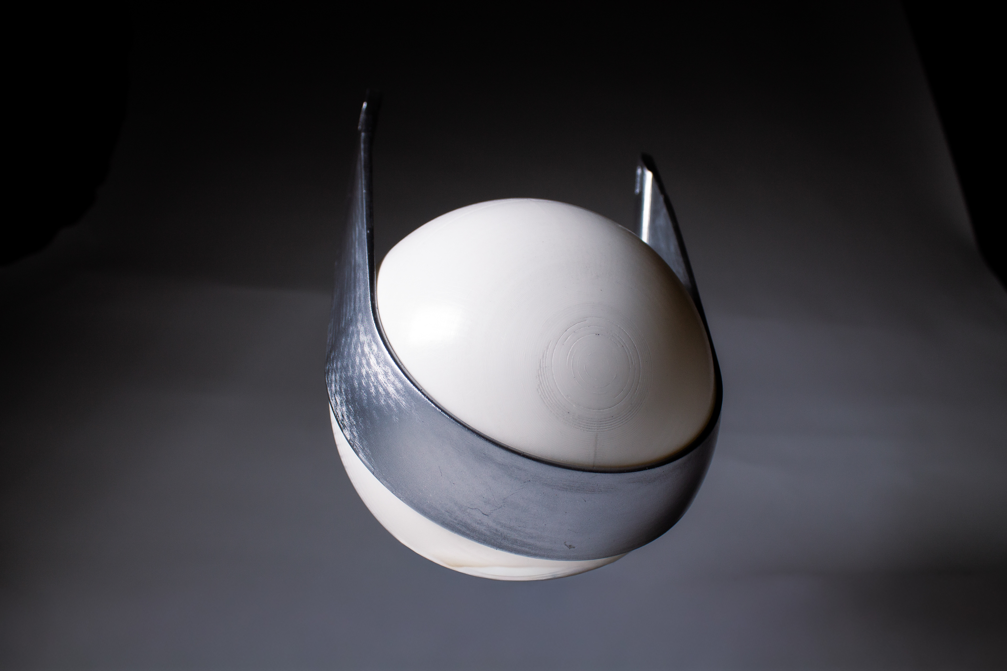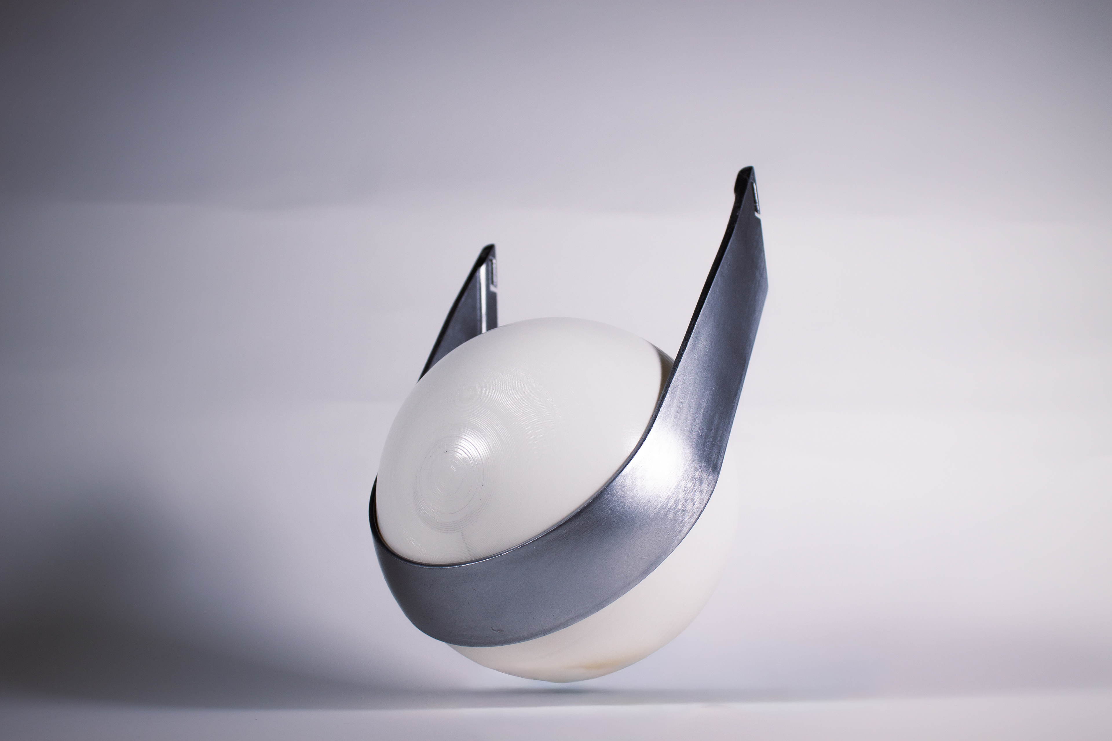 Inspired by the streamline movement, my battery powered lamp, Sling, is fully 3D printed from PLA using a Bamboo A1. The band is spray painted chrome and the base features a simple circuit connecting LED to batteries to button. In production, as told through the poster, the final product would be made of a frosted glass body and a stainless steel band.