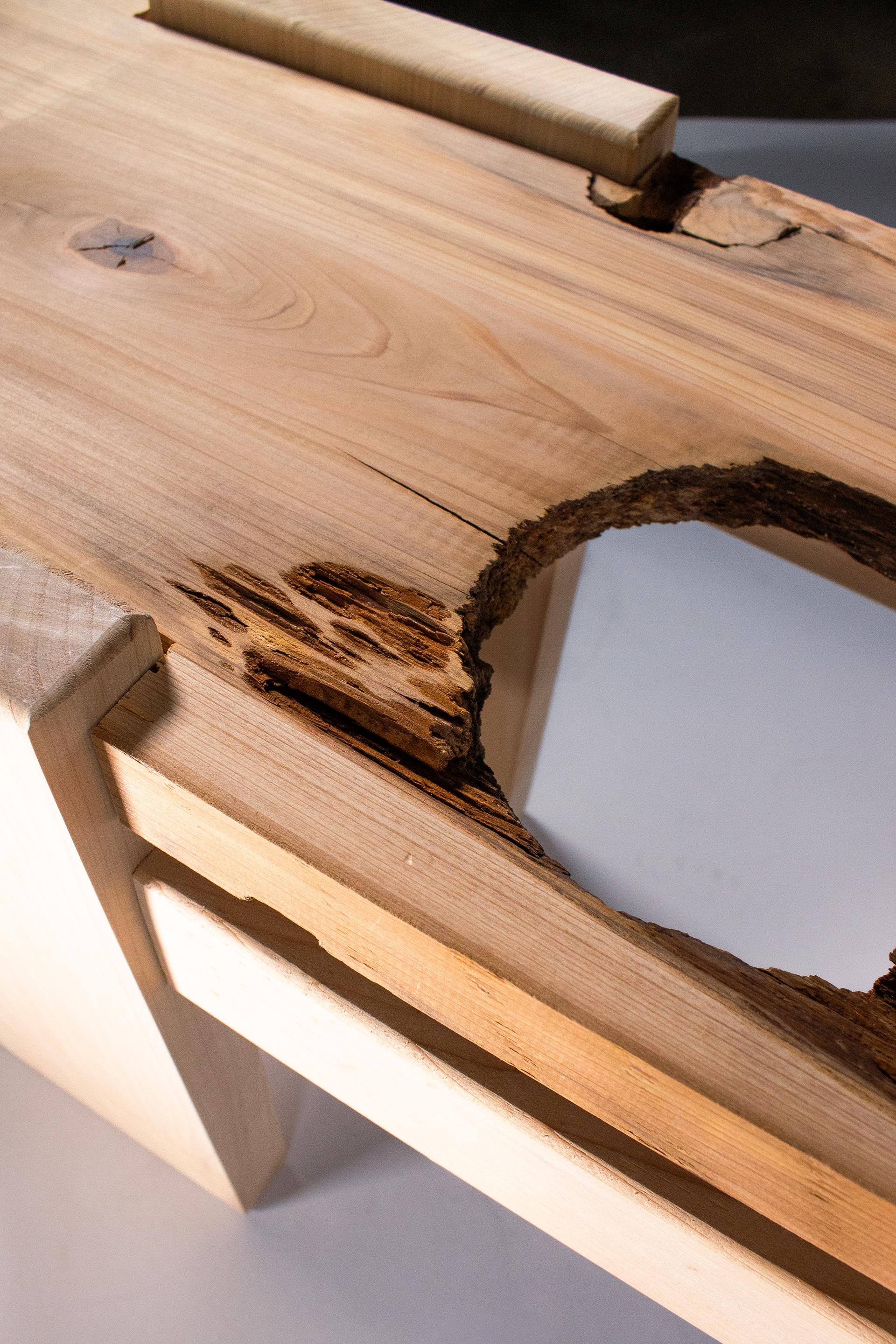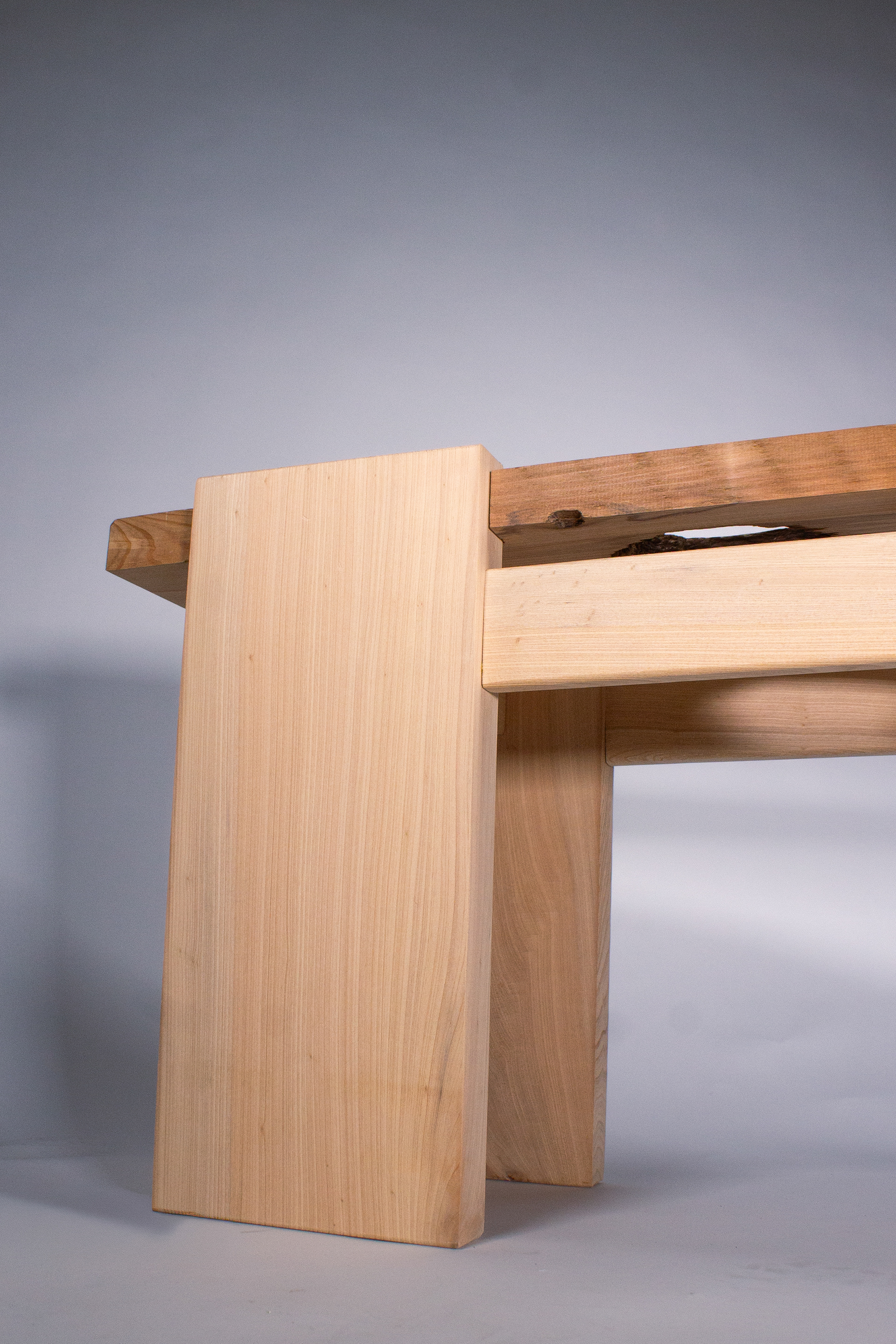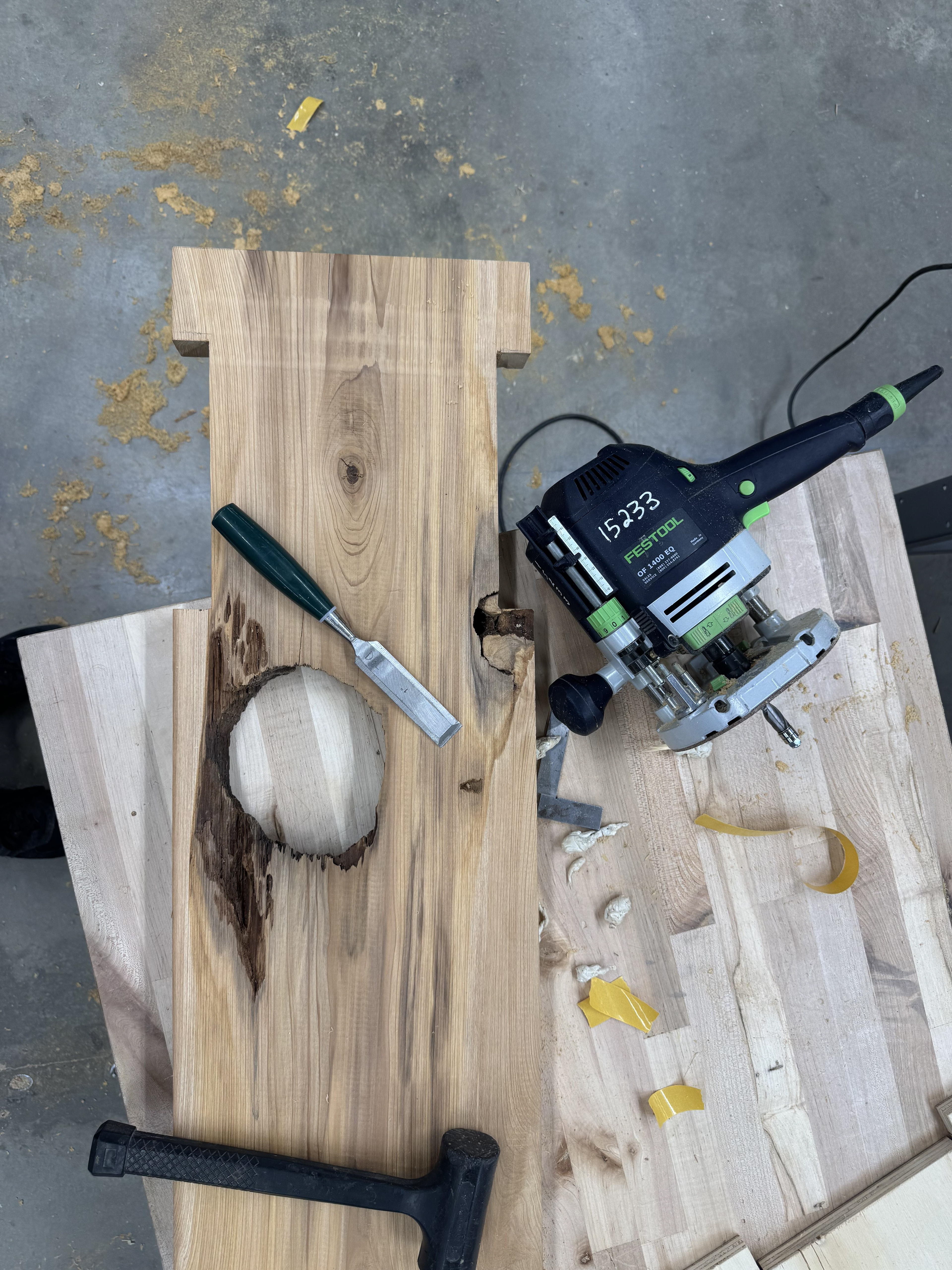 Step two was preparing all of my pieces. With the wood having sat so long, I hit it all with a wire brush and air hose to clean it before sending it through the joiner and planer. After that, I used a router and chisel on my bench top to clean up the fallen out knot and make the leg slots. Next, I cut out my aprons and legs and hit all the hard edges with a router bit on the router table to avoid damage when being moved. Finally, I added domino joints and glue to secure all of the pieces together, screwed the top board on, and later finished it with a clear finish.