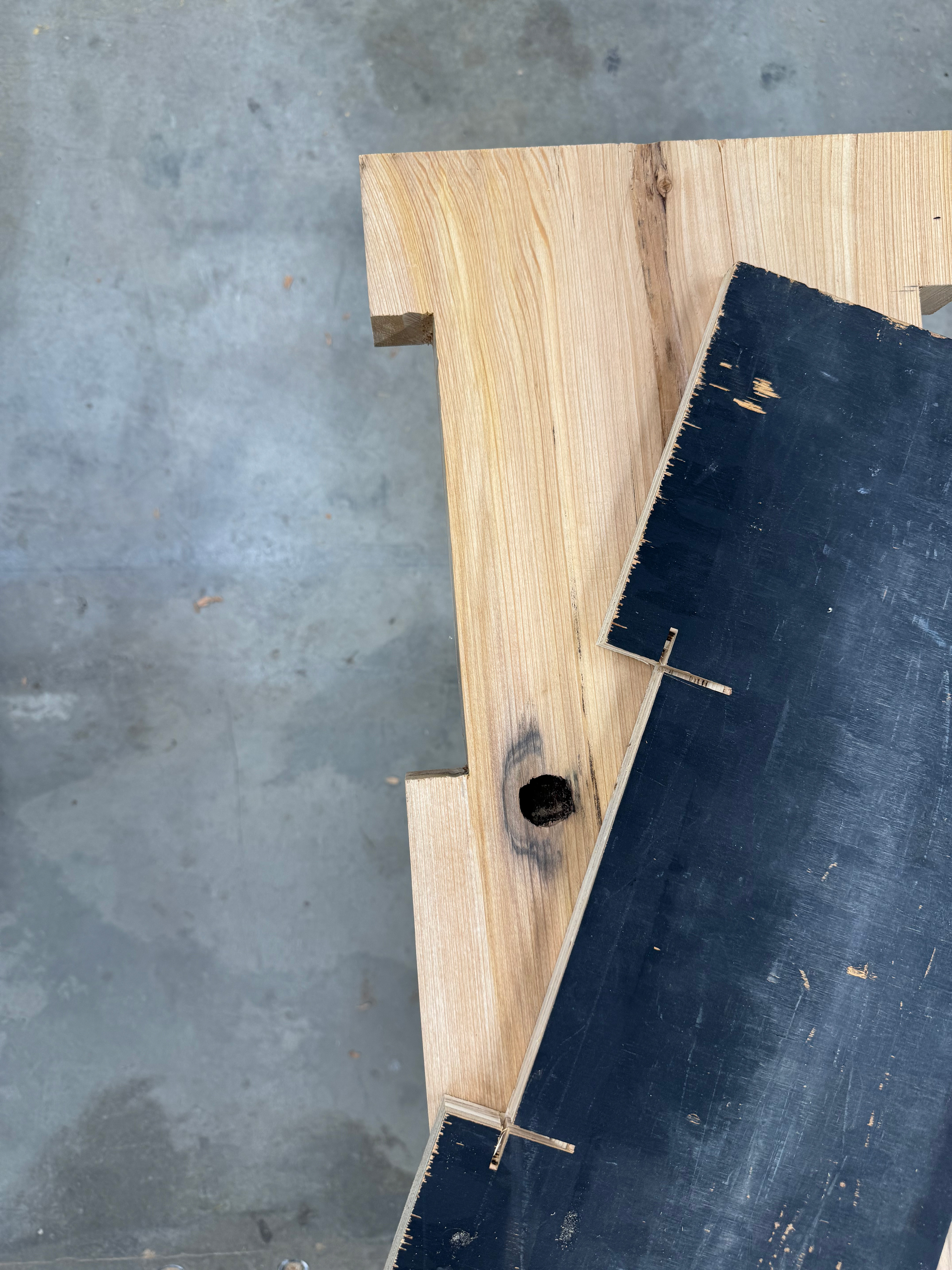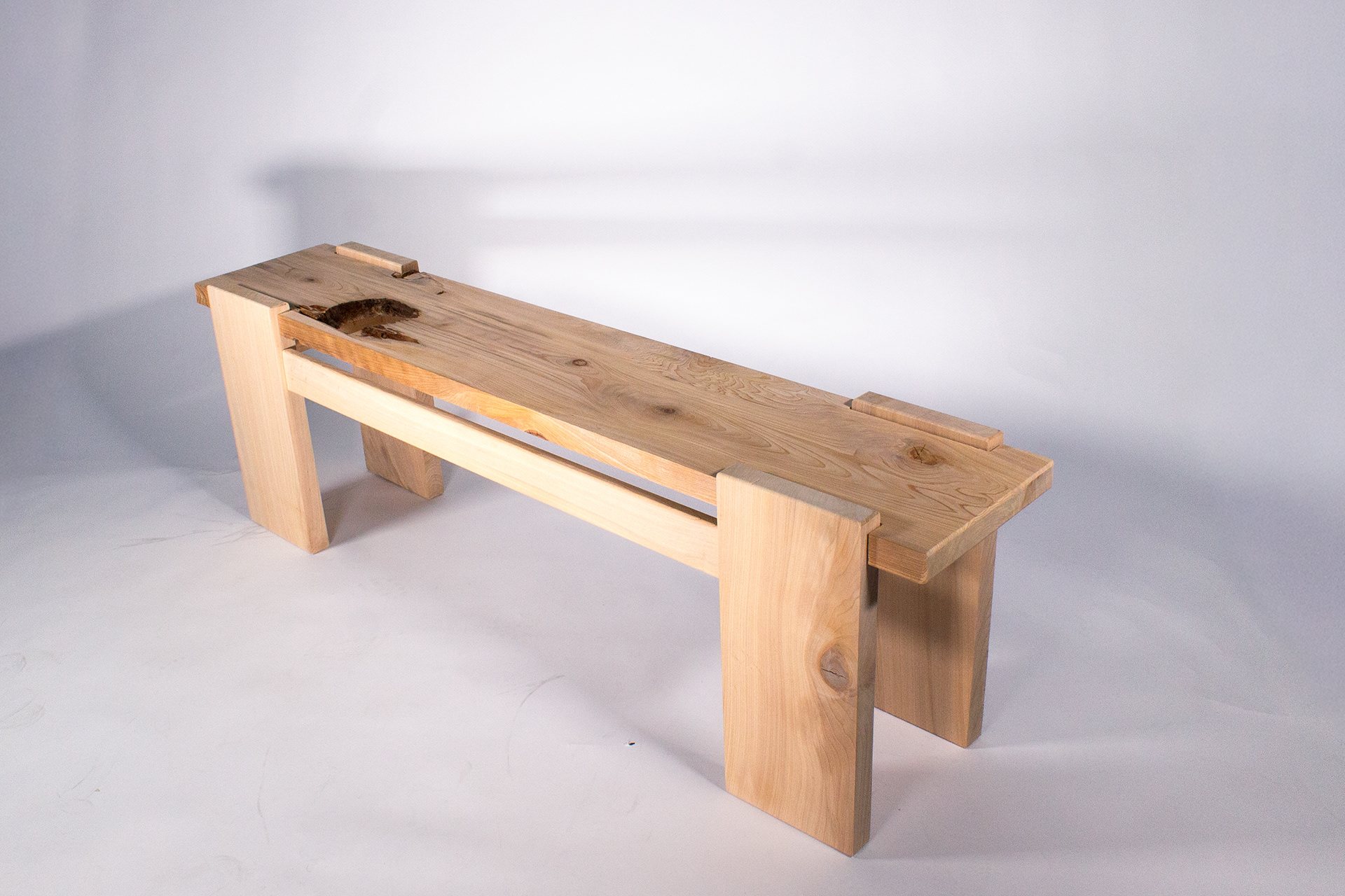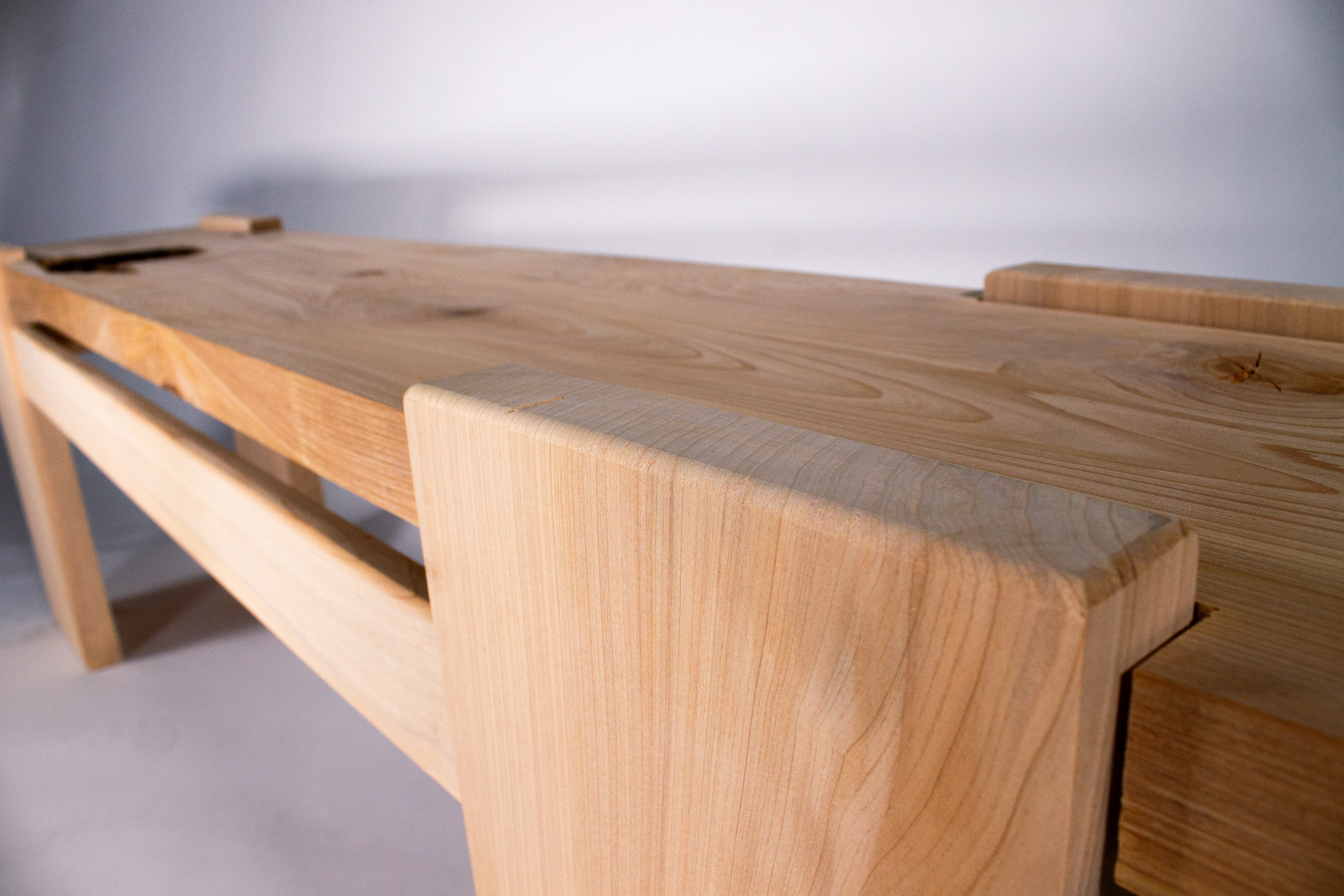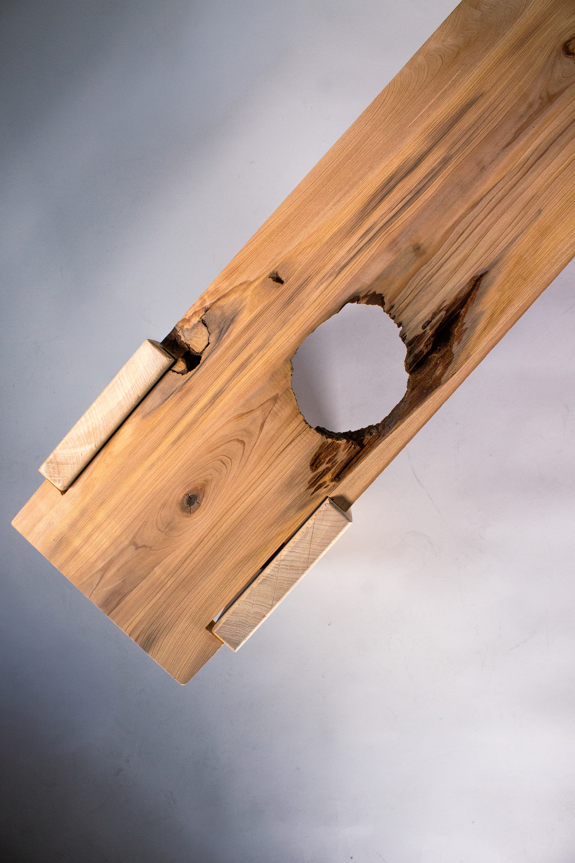 Step two was preparing all of my pieces. With the wood having sat so long, I hit it all with a wire brush and air hose to clean it before sending it through the joiner and planer. After that, I used a router and chisel on my bench top to clean up the fallen out knot and make the leg slots. Next, I cut out my aprons and legs and hit all the hard edges with a router bit on the router table to avoid damage when being moved. Finally, I added domino joints and glue to secure all of the pieces together, screwed the top board on, and later finished it with a clear finish.